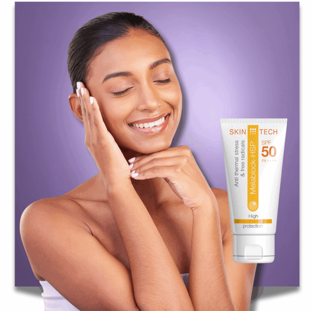 Melablock-HSP® SPF 50, lazer, peeling ve benzeri işlemler sonrası cildi güneşin zararlı etkilerine karşı 360° korur. Isı Şok Proteinlerinin (HSP) doğal sentezini aktive ederek, cildi termal hasara, protein denatürasyonuna ve hücre lizine karşı savunur.